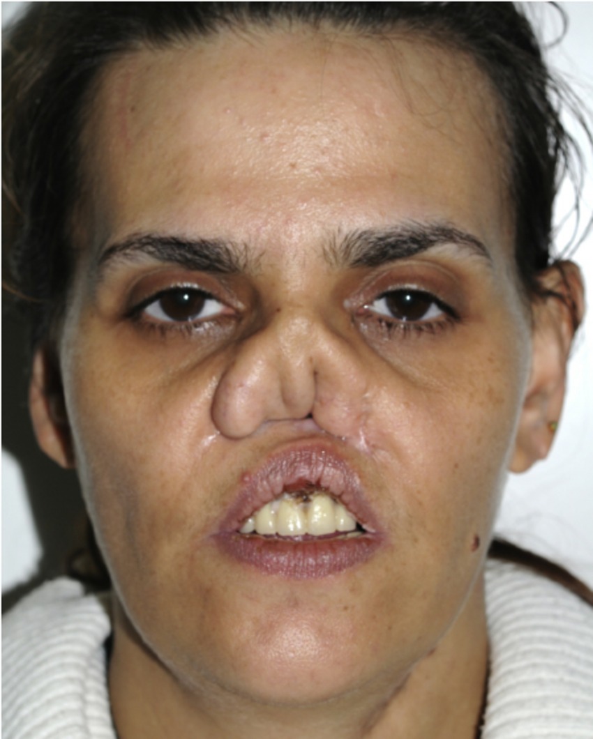 コカインを吸引し続けて鼻が変形してしまった女性の画像。
