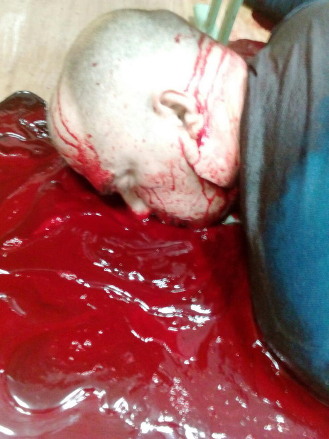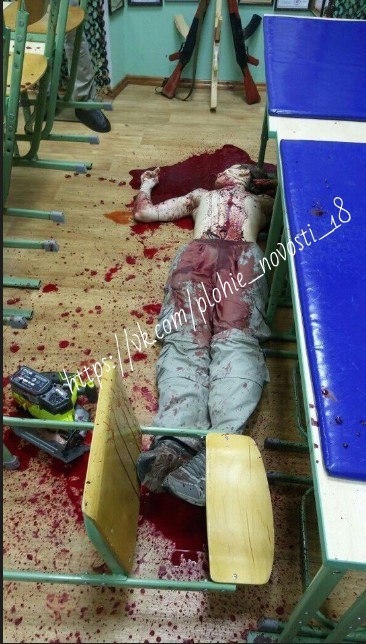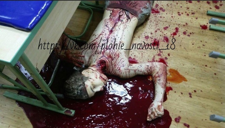 ロシアのモスクワで撮影された画像。18歳の大学生の男が教師をナイフで刺して殺したあと、電動ノコギリで首を切って自殺した事件。
