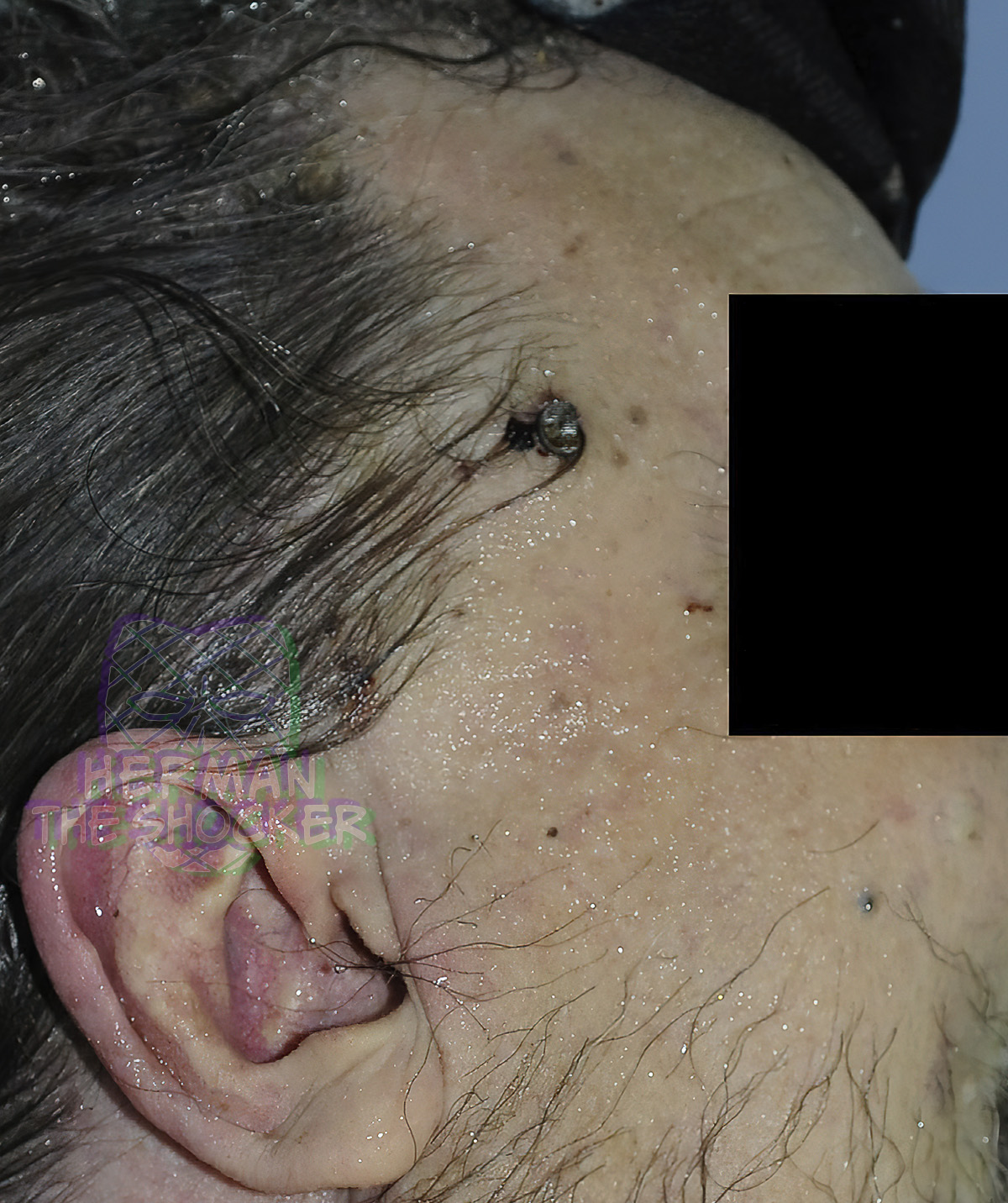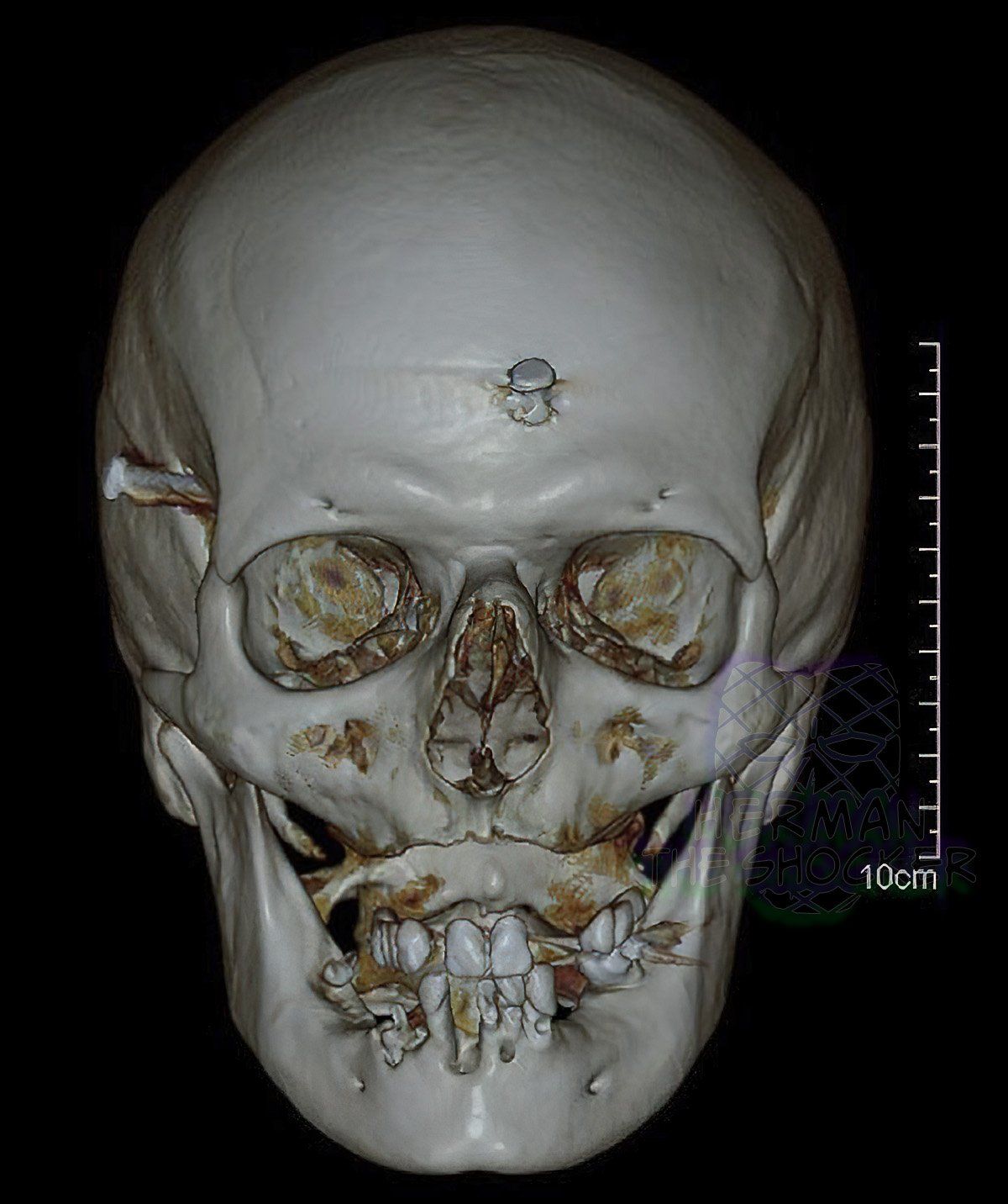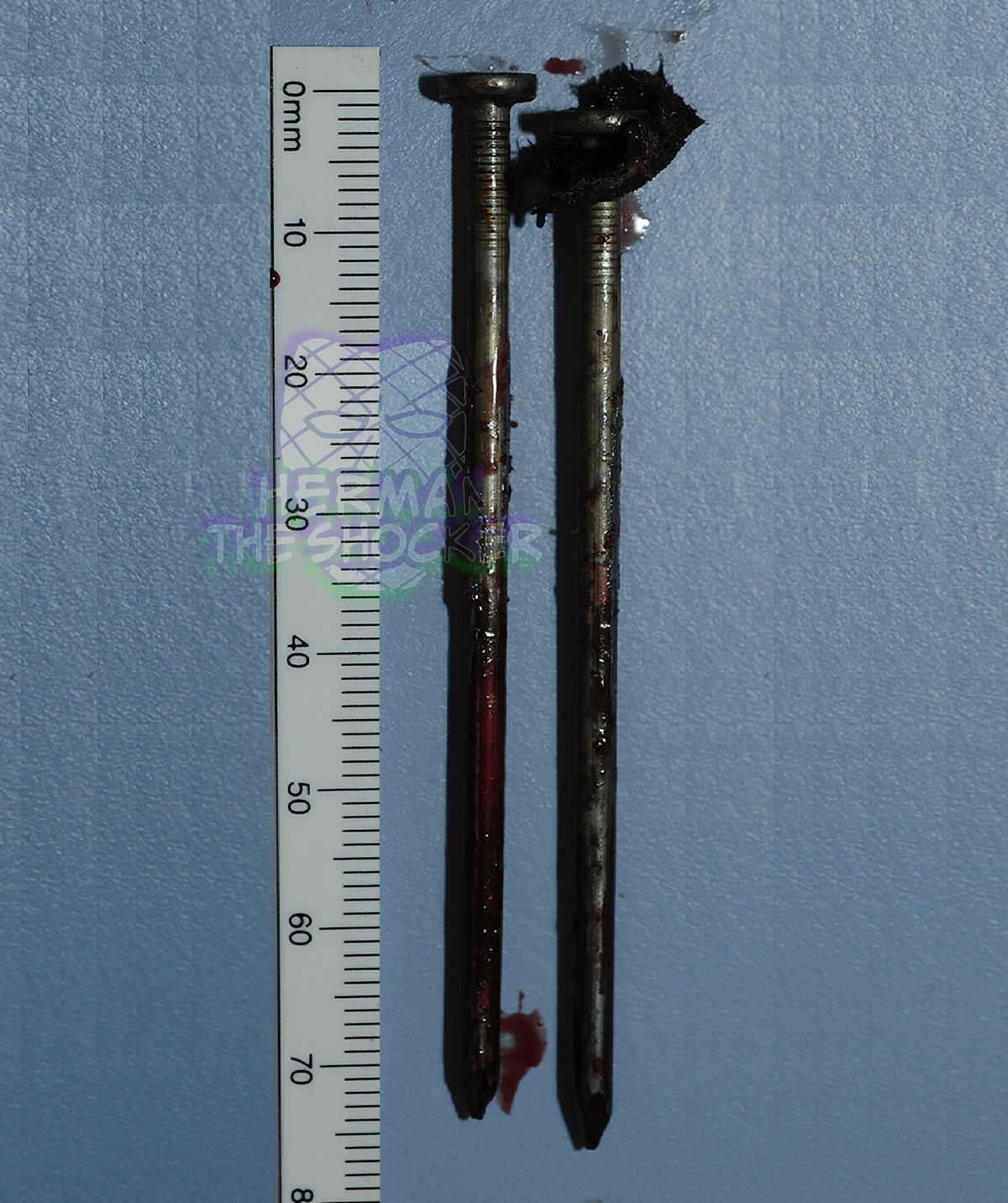 ネイルガンで自分の頭に釘を2本打ち込んで自殺した男性の画像。