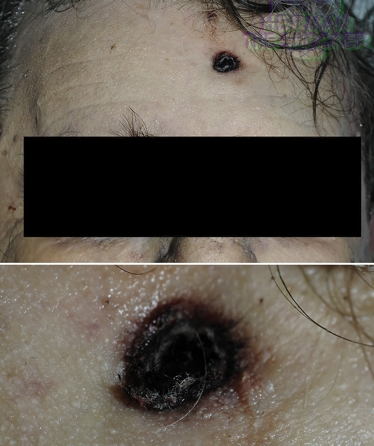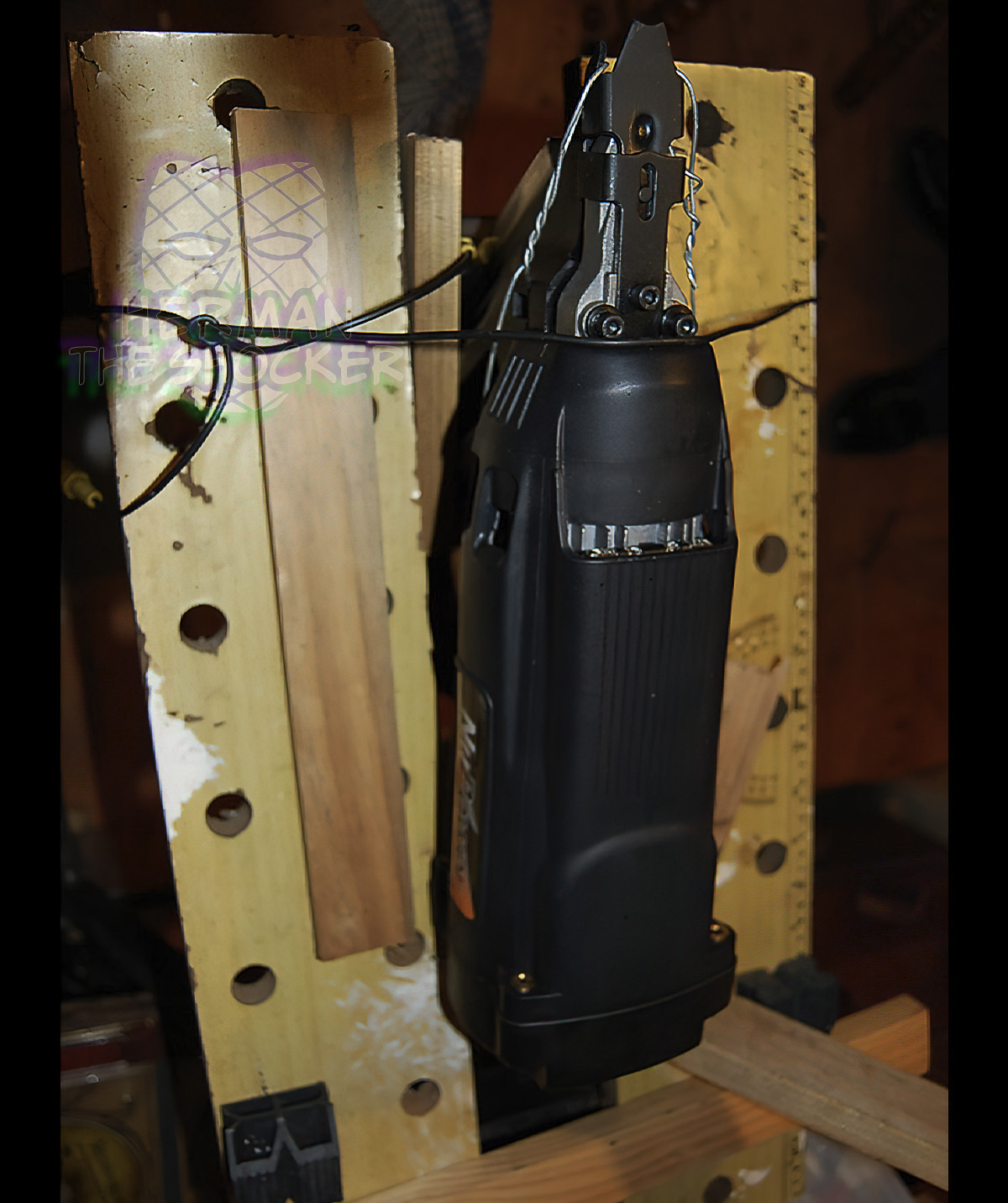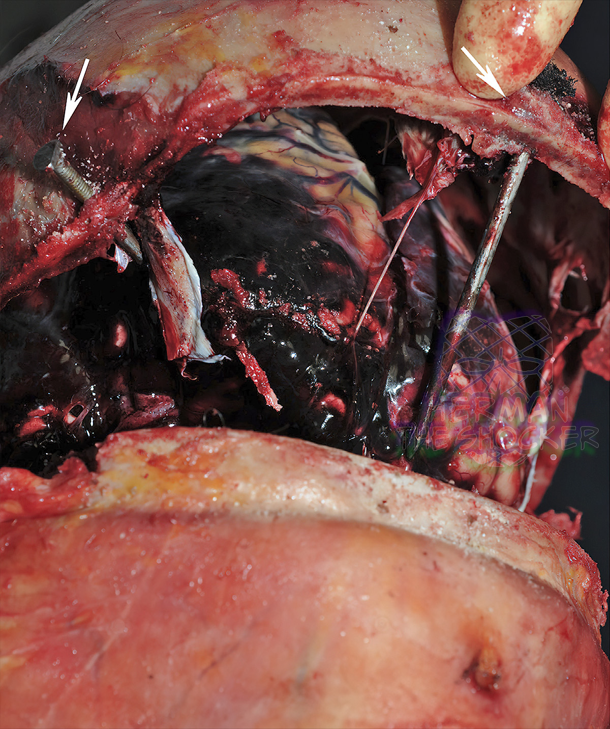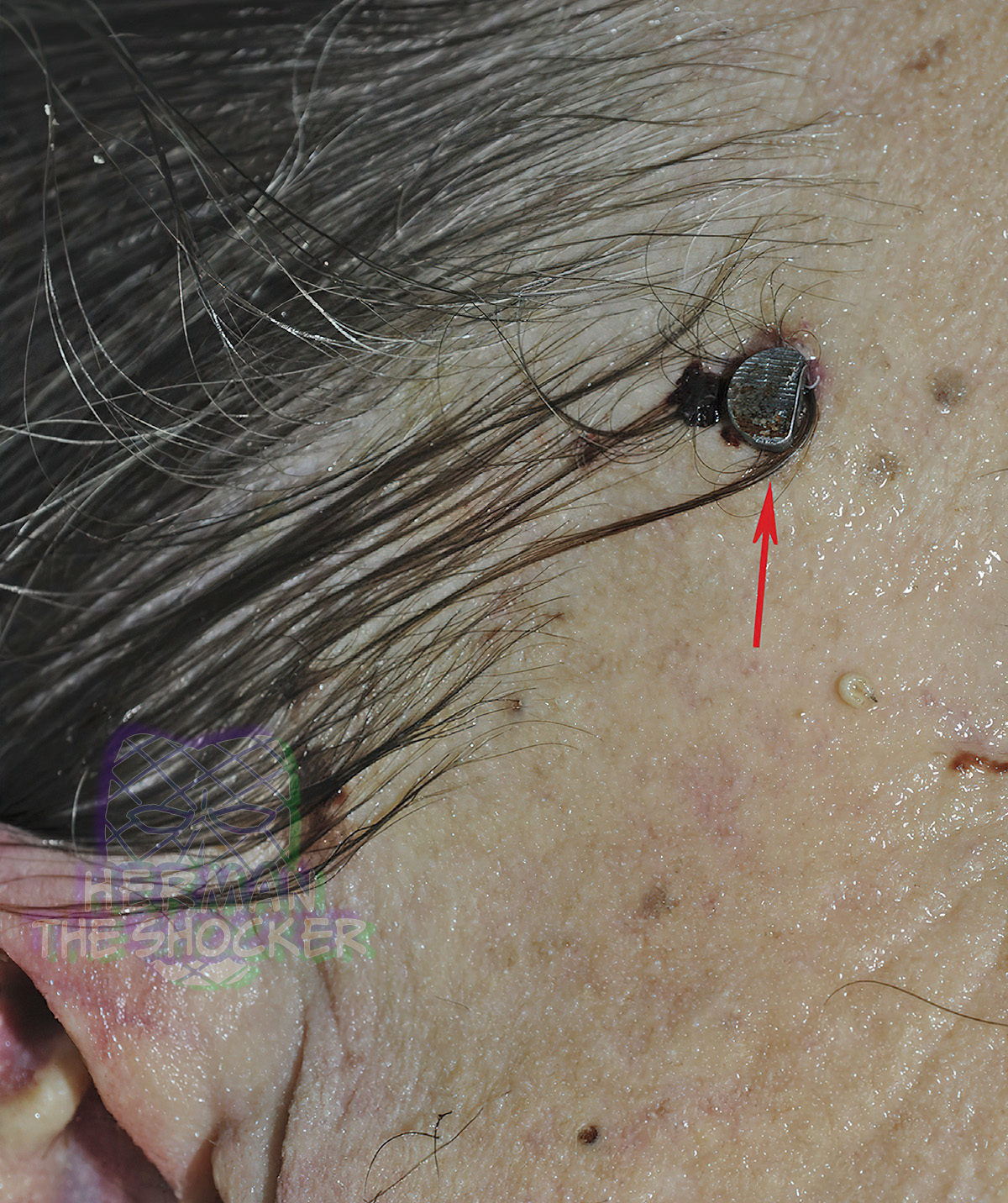 ネイルガンで自分の頭に釘を2本打ち込んで自殺した男性の画像。