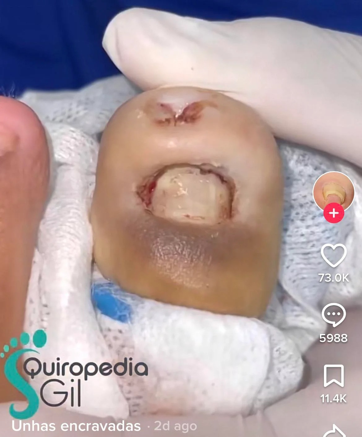 爪が周囲の皮膚に刺さってしまう陥入爪患者の手術画像。