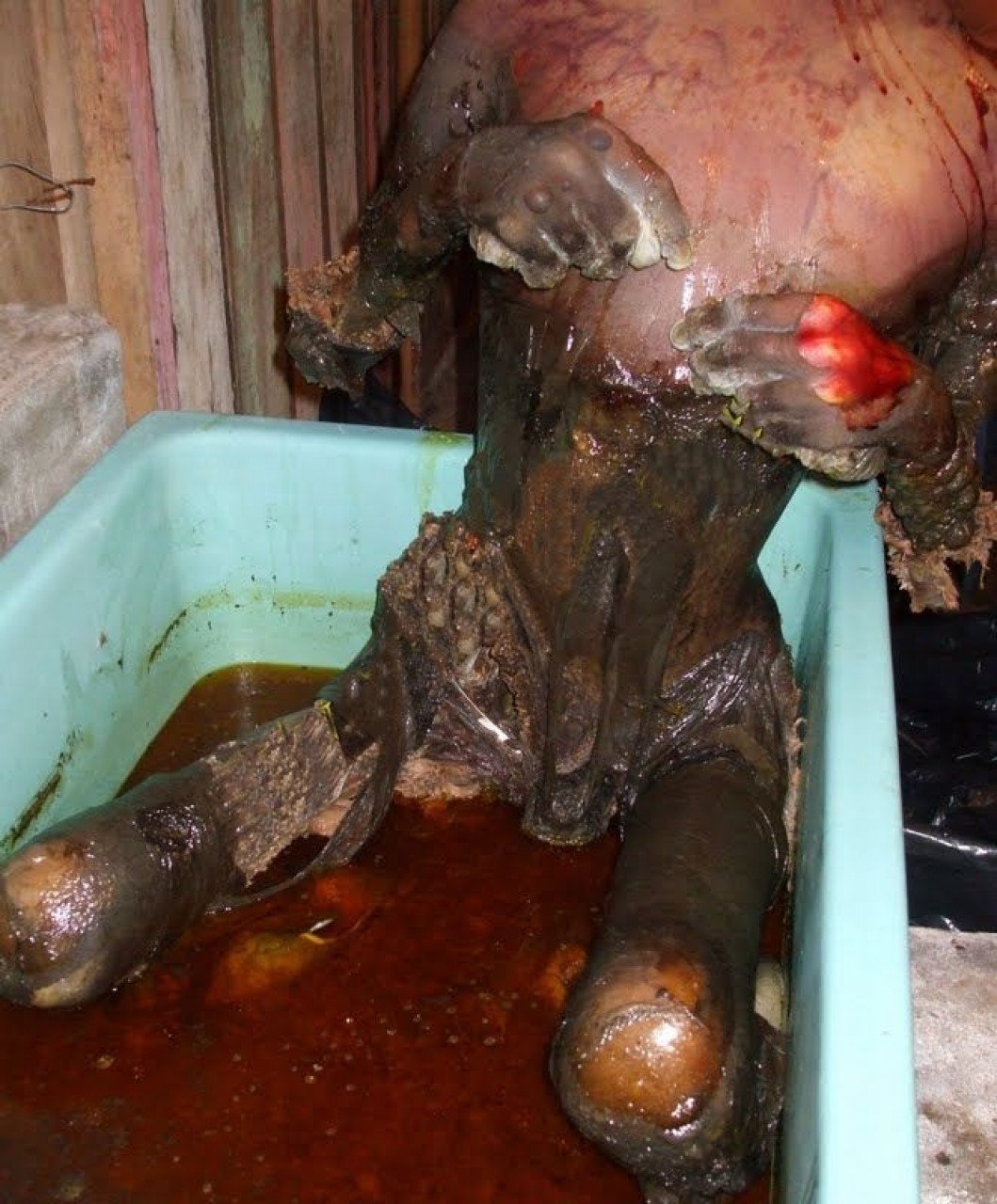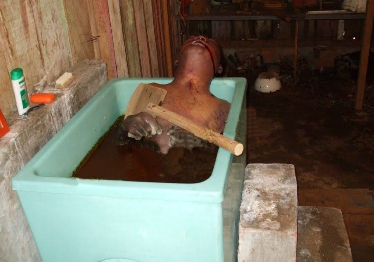 湯船に浸かったまま死んでしまった男性の死体画像。