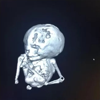 コロンビアにて、腹痛のため病院にやってきた77歳の女性の体内から石灰化した胎児を発見した画像。