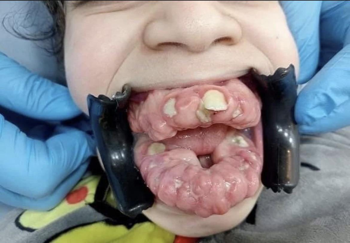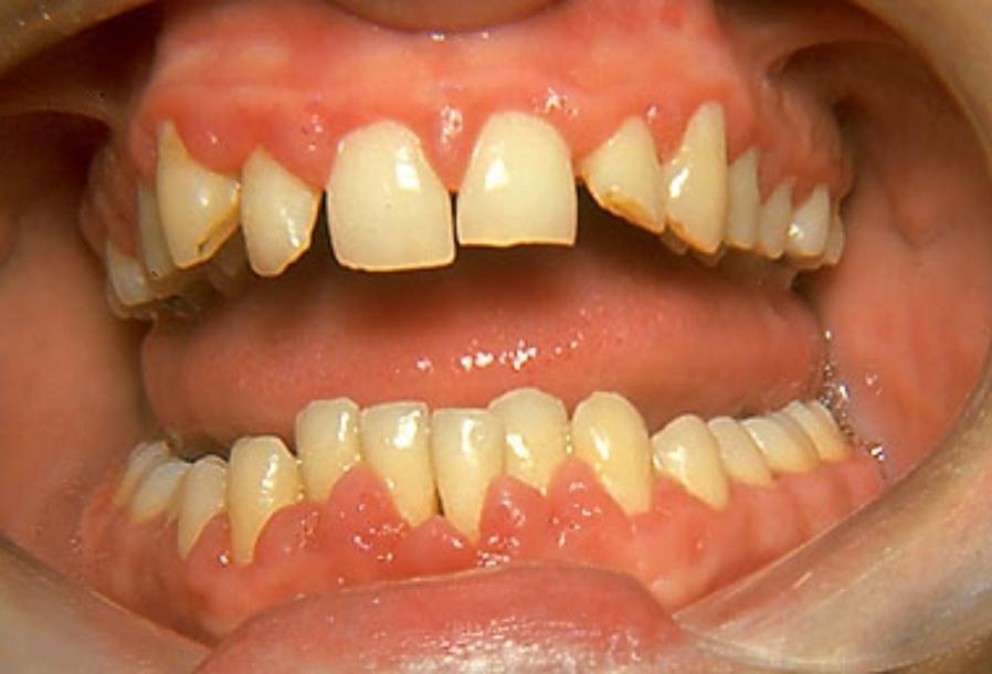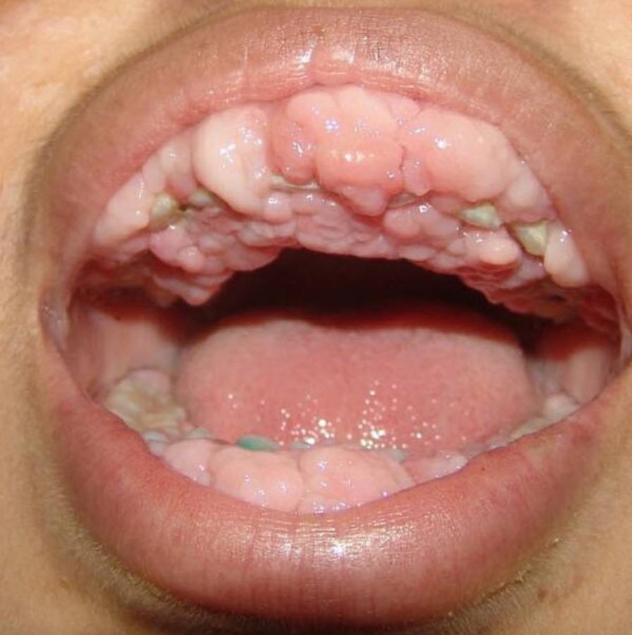 知的障害とてんかんを持って生まれた10歳の少女の歯茎が肥大してしまった画像。