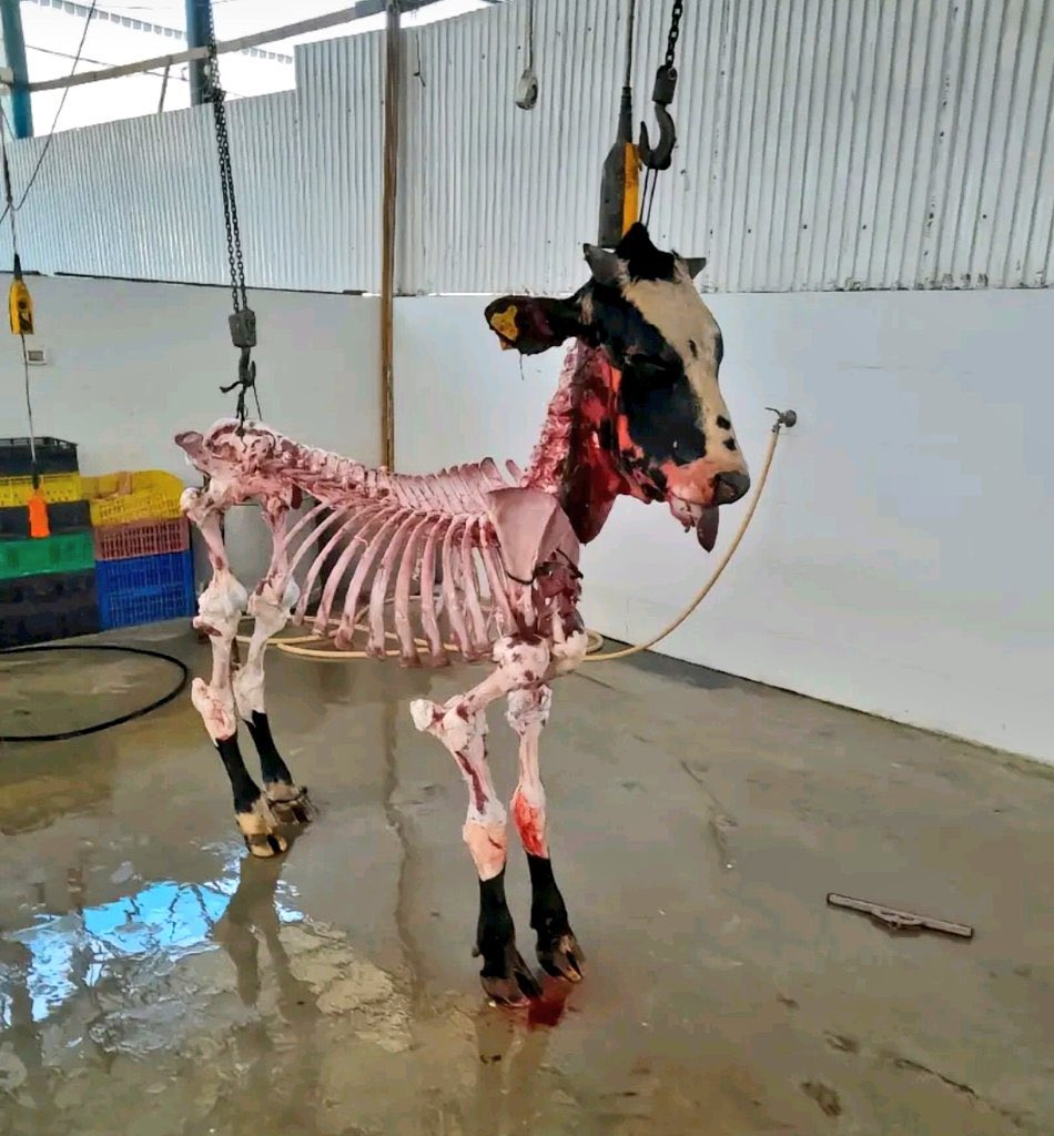 屠殺場にて、牛の骨だけを残して肉を削ぎ落とした画像。