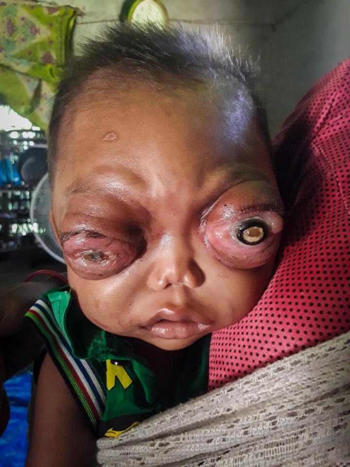 インドにて、生後2ヶ月で目が腫れ始めて、徐々に視力を失いつつある2歳の子どもを撮影した画像。