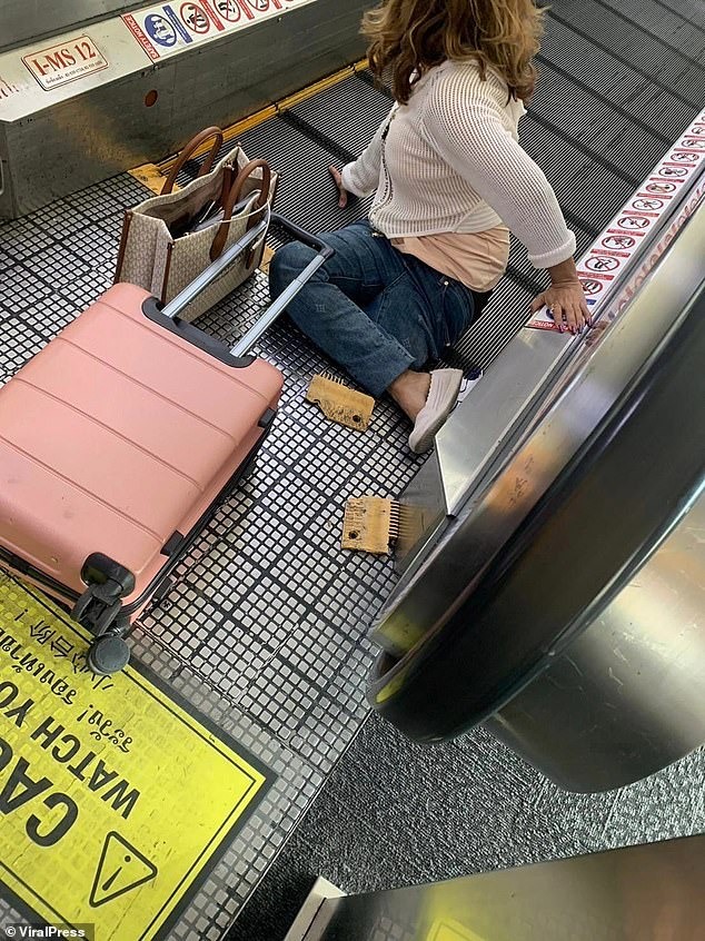 タイの首都バンコクのドンムアン国際空港にて6月29日、動く歩道に左足を巻き込まれて切断されてしまった57歳の女性の画像。