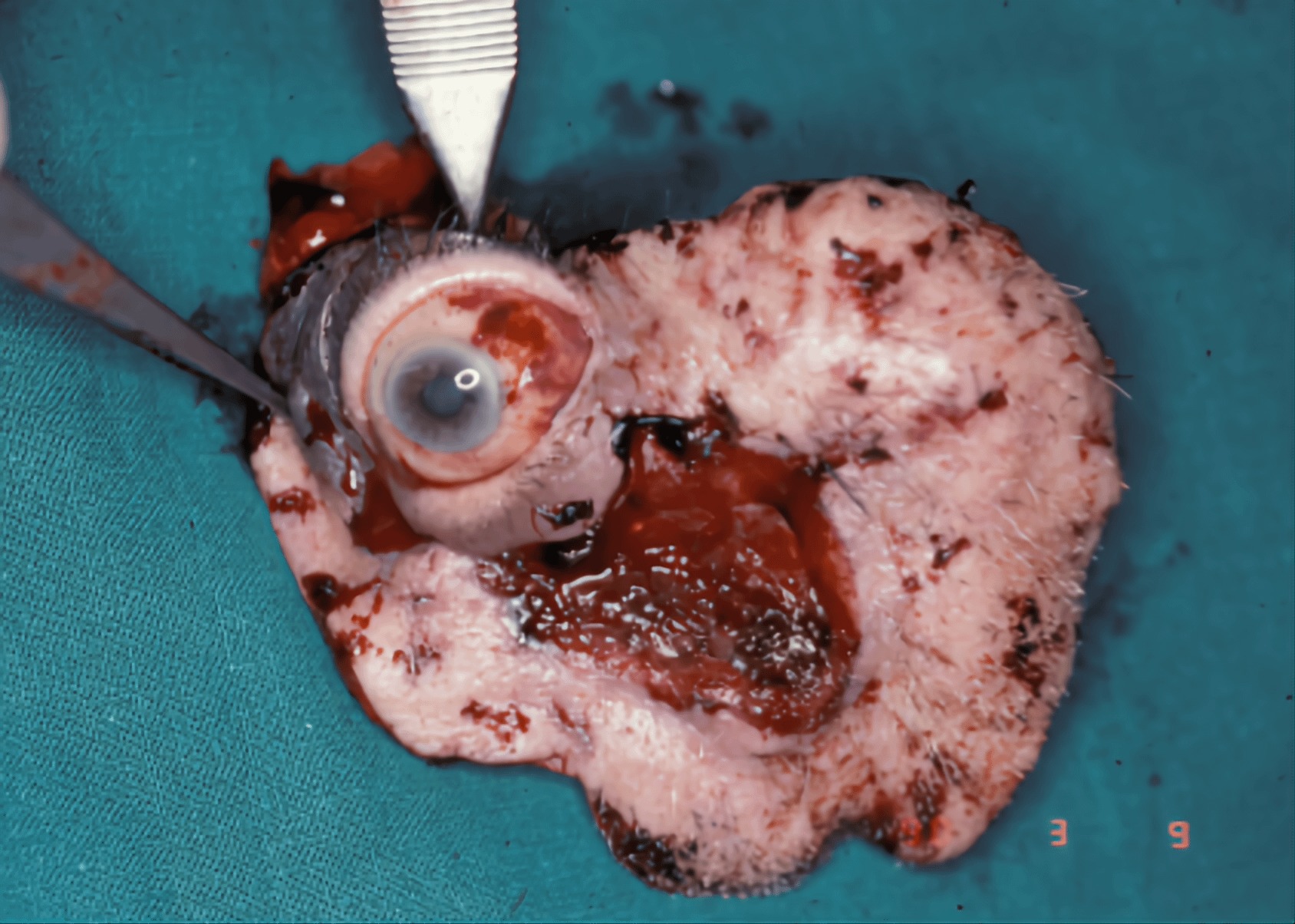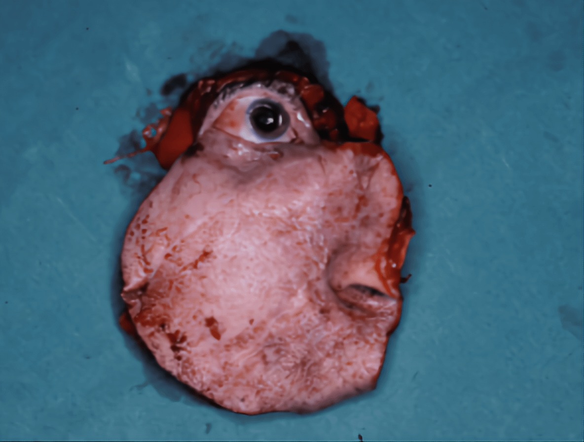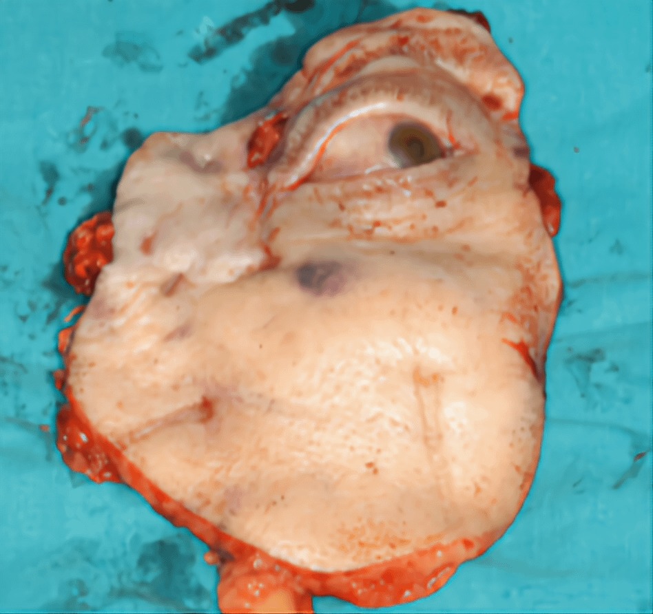 ガンのため切除された眼球と周辺の皮膚を撮影した画像。