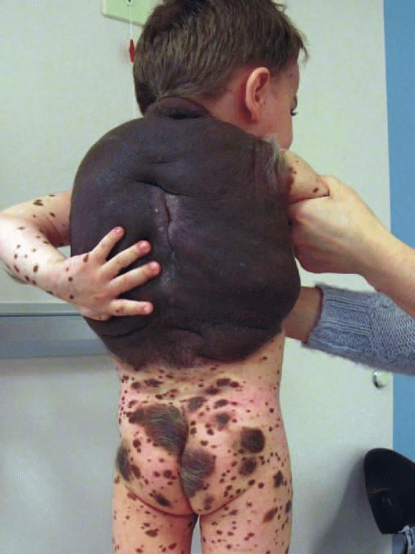 幼い男の子の背中に出来た先天性の巨大な色素性母斑(ほくろ)を撮影した画像。
