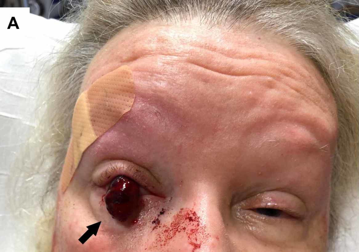 75歳の女性が転倒し、かけていたメガネが割れて右目が破裂してしまった画像。