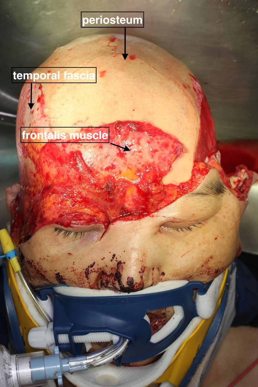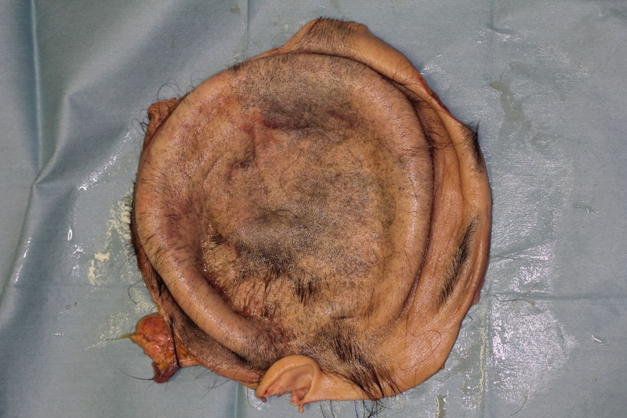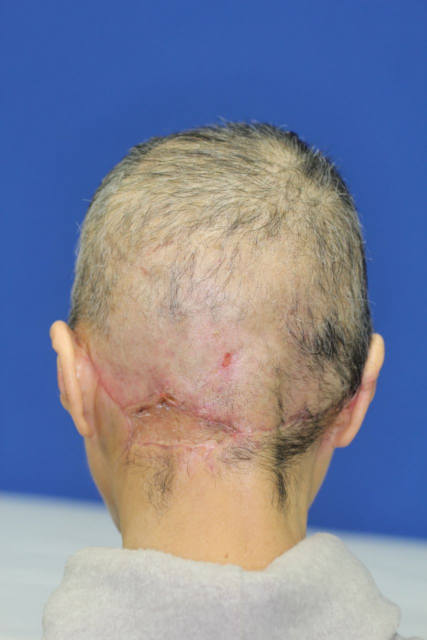 紡績機に巻き込まれて頭皮がはがれてしまった女性の画像。