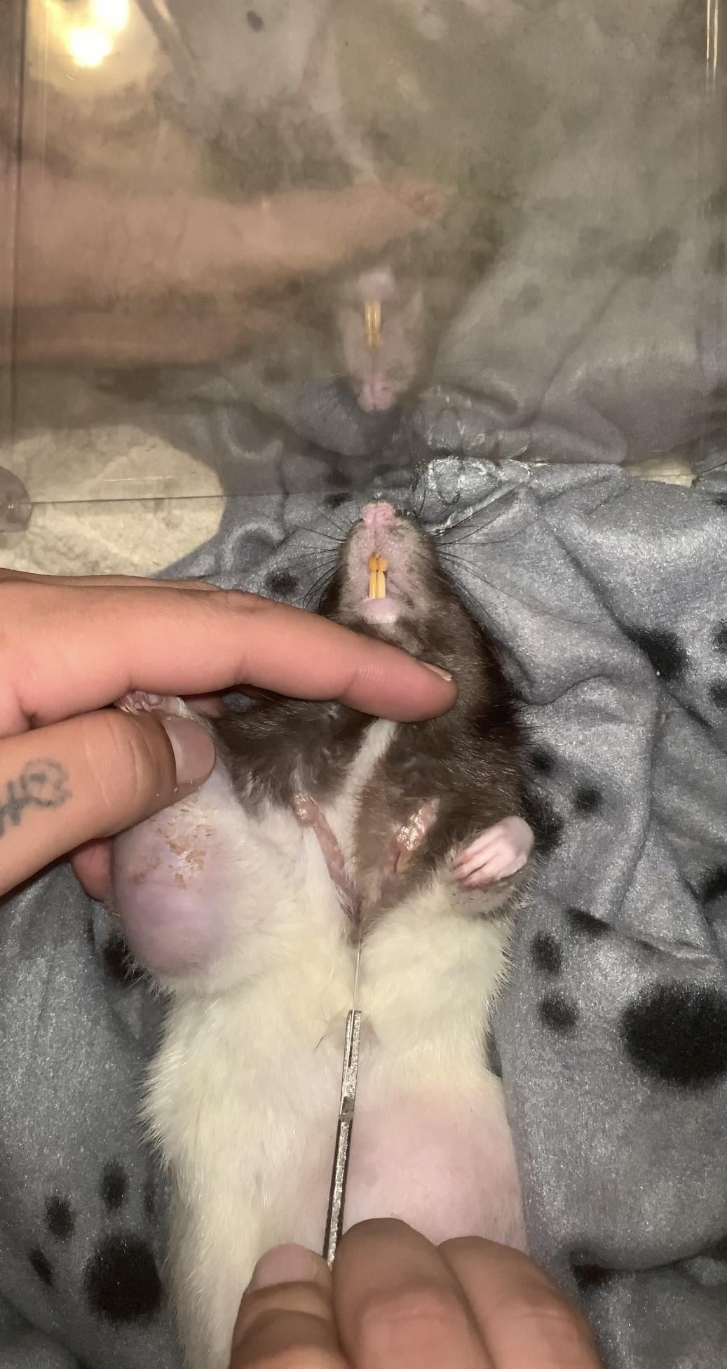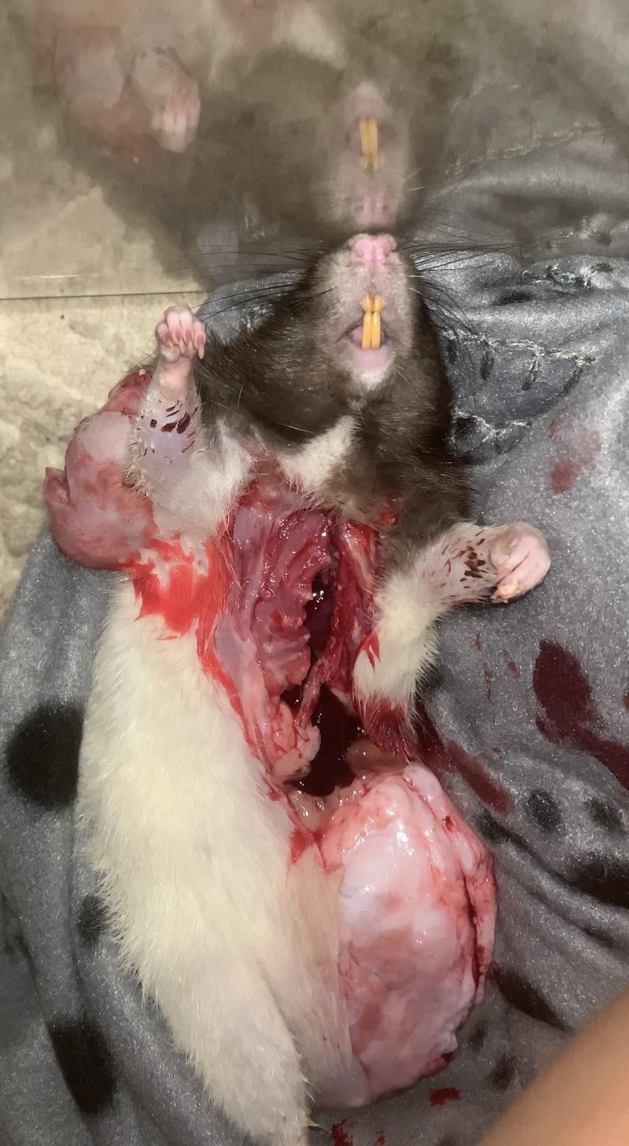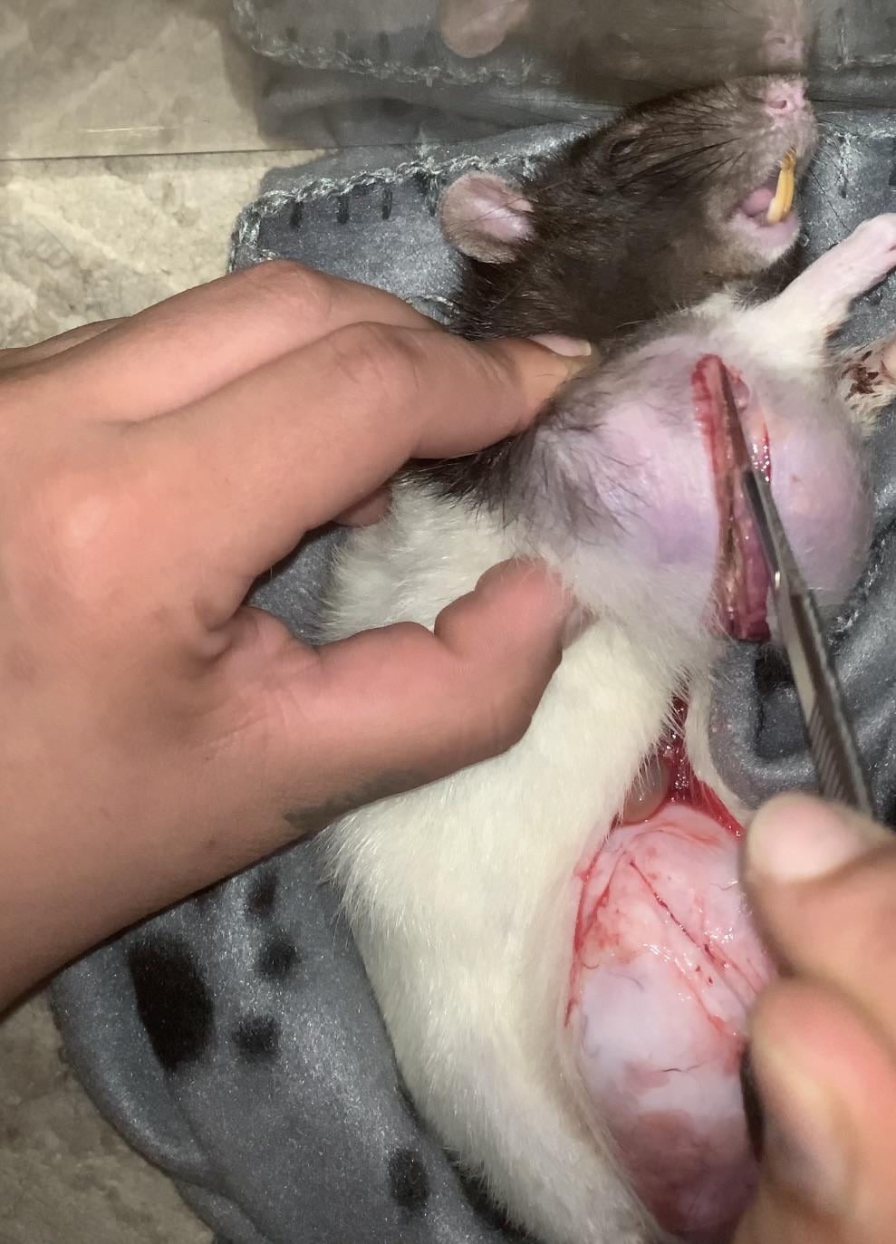腫瘍を発症し、動物病院で安楽死させたペットのネズミを解剖してみた画像。