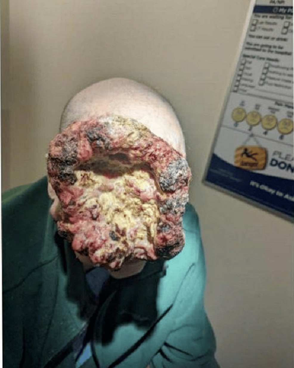 男性の顔には扁平上皮癌による大きな腫瘤があり、悪臭を放っていた。男性は自分の額に小さなしこりがあることに気づき、それが少しずつ大きくなっていったため病院の診察を受けようとしたものの、新型コロナウイルス感染症のパンデミック中で手術を延期され続けていた。