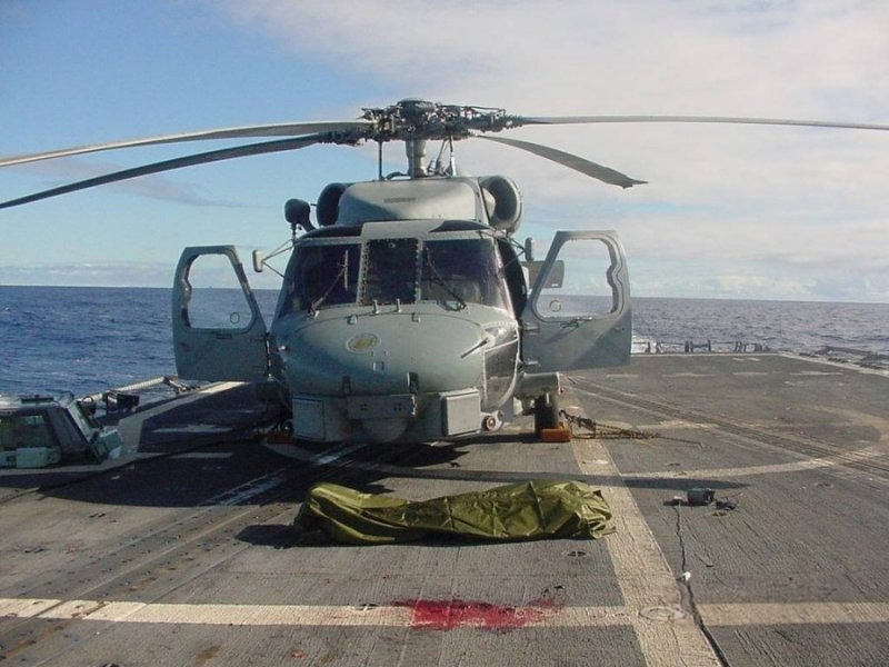 米海軍の航空整備士が、まだプロペラが回転しているヘリに近づき、頭を破壊されてしまった画像。