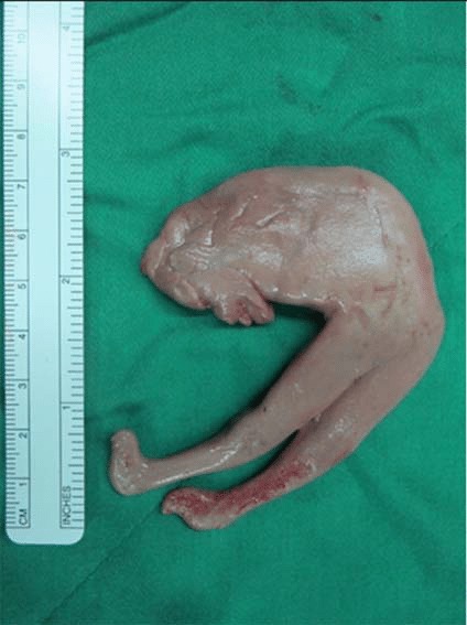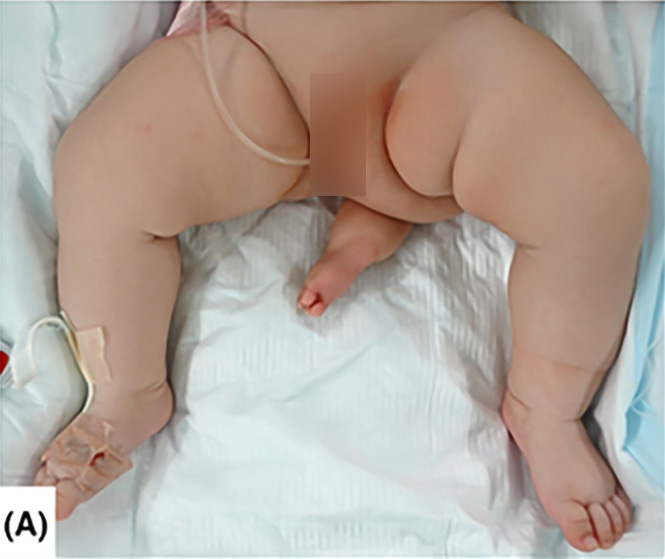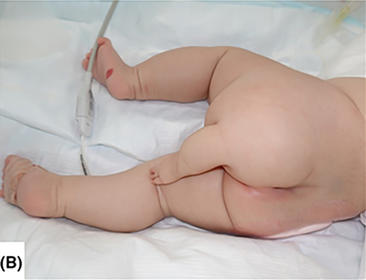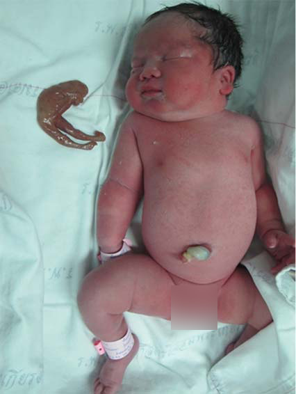 お尻部分にもう1本の足が生えた状態で産まれてきた赤ちゃんの画像。