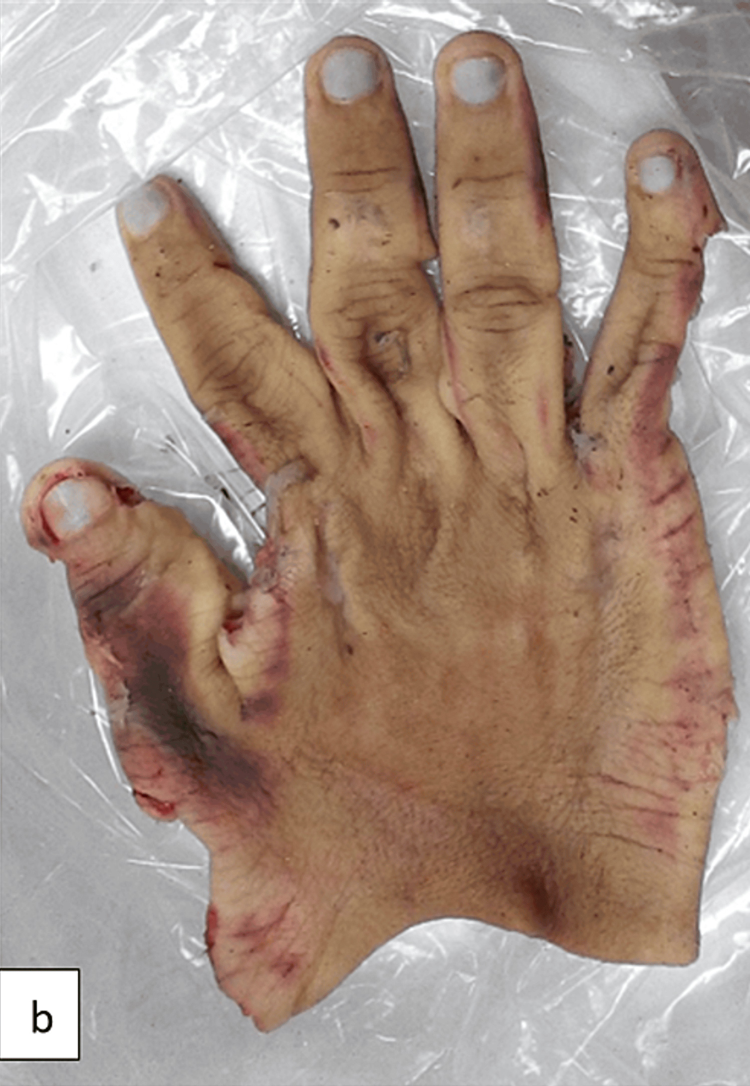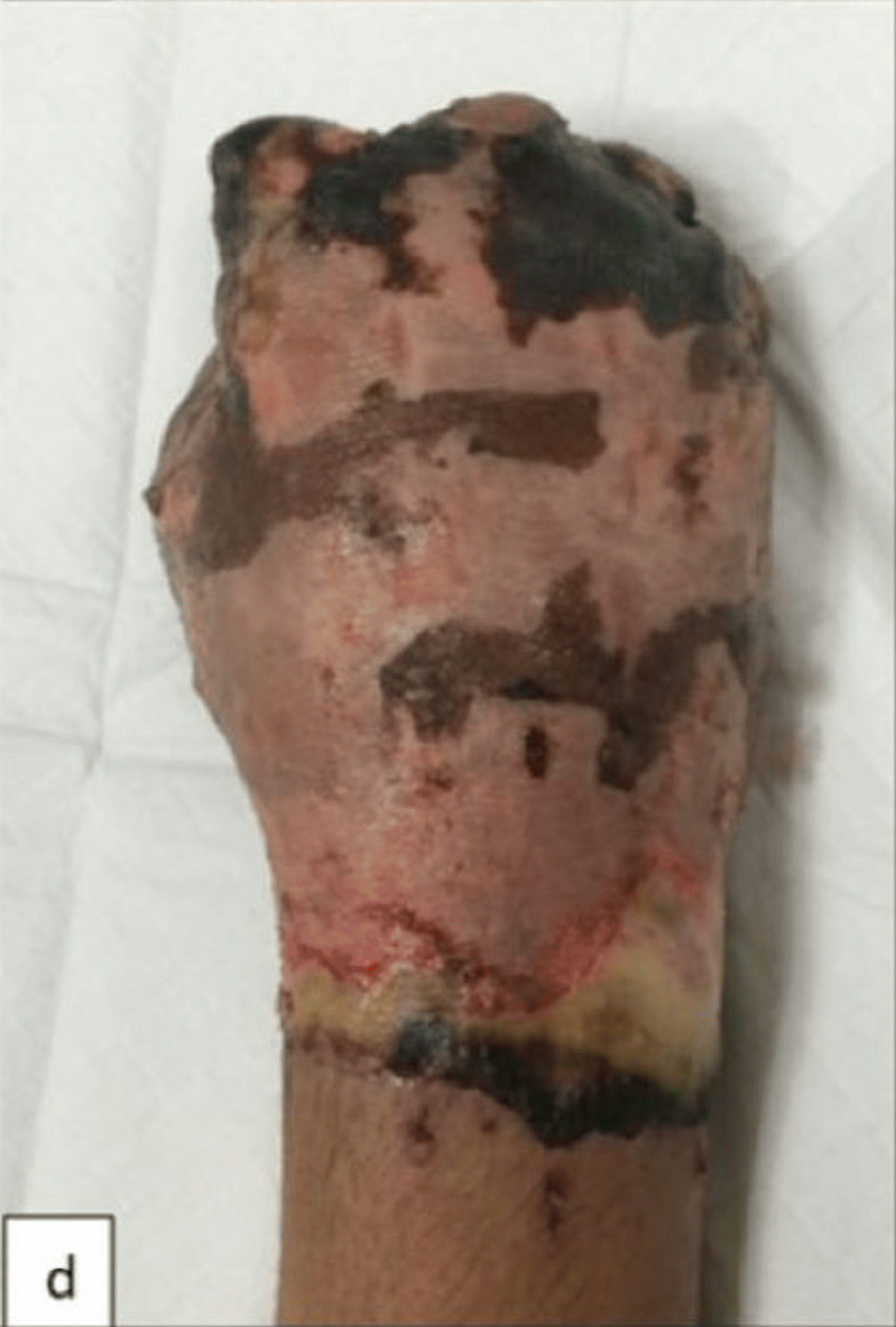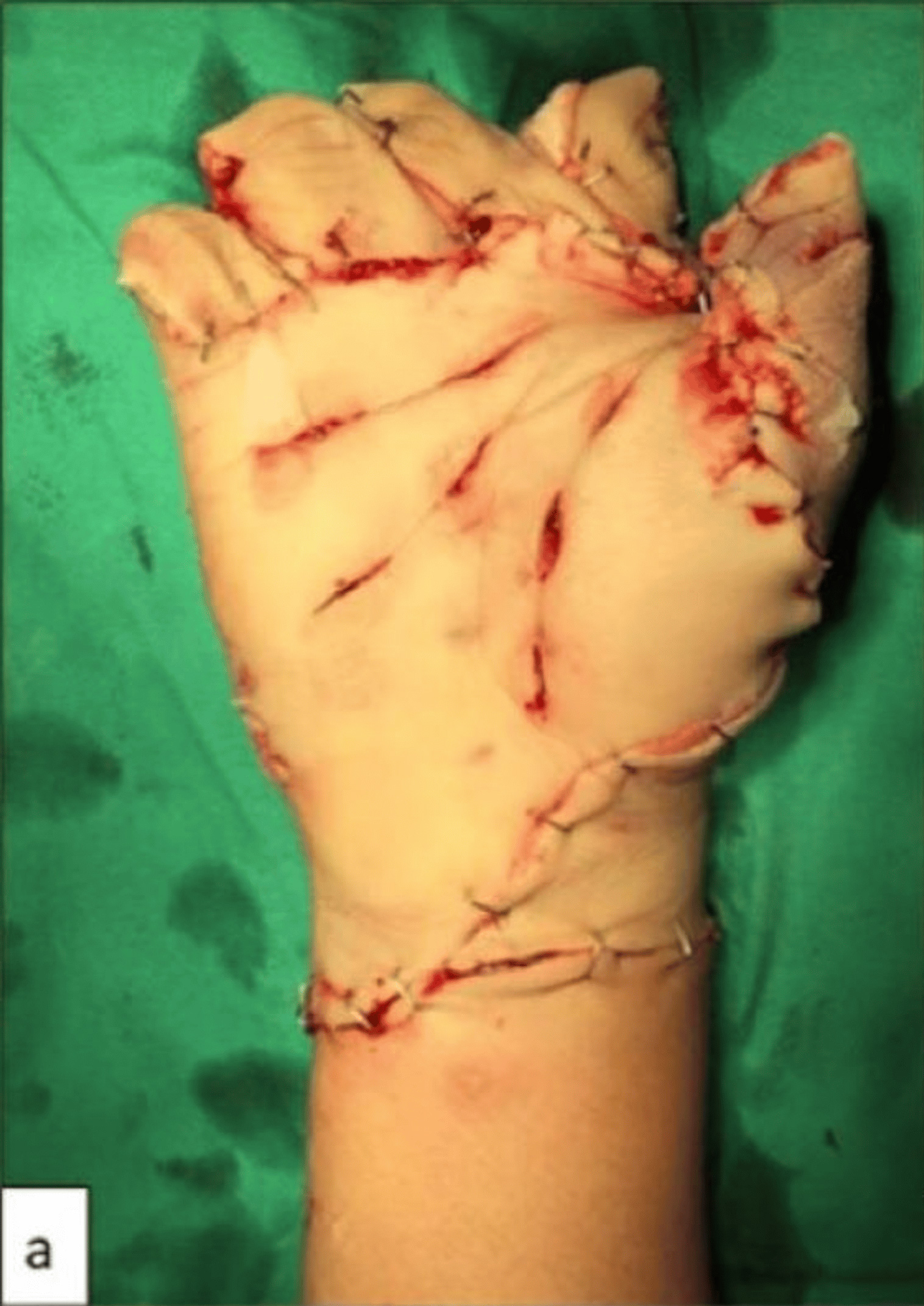 機械に手を巻き込まれ、皮膚を剥がされてしまった23歳男性の手術工程画像。