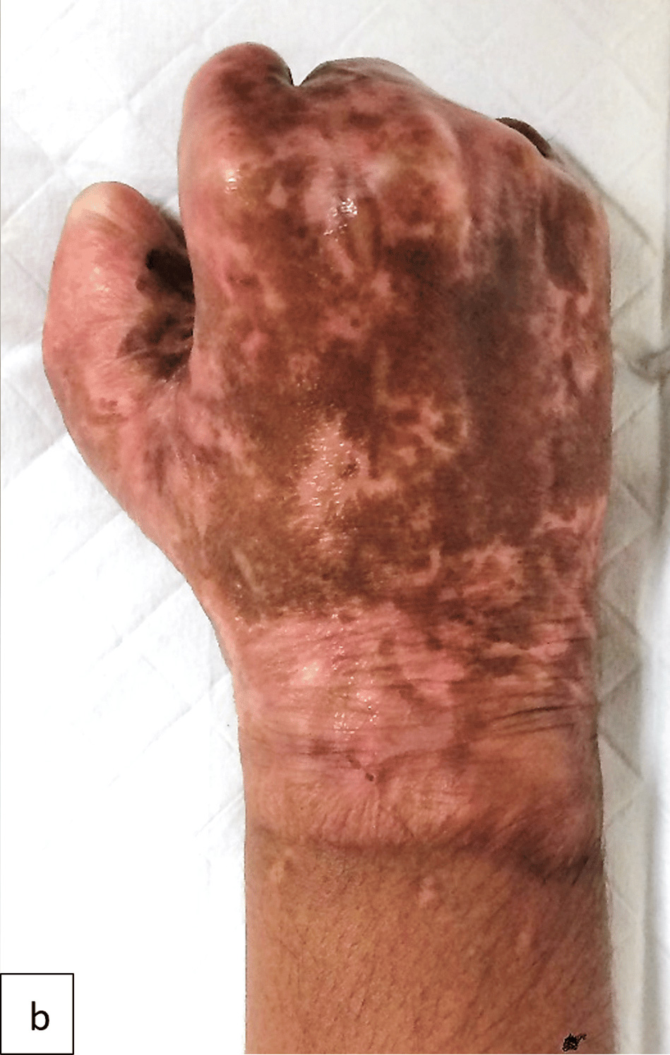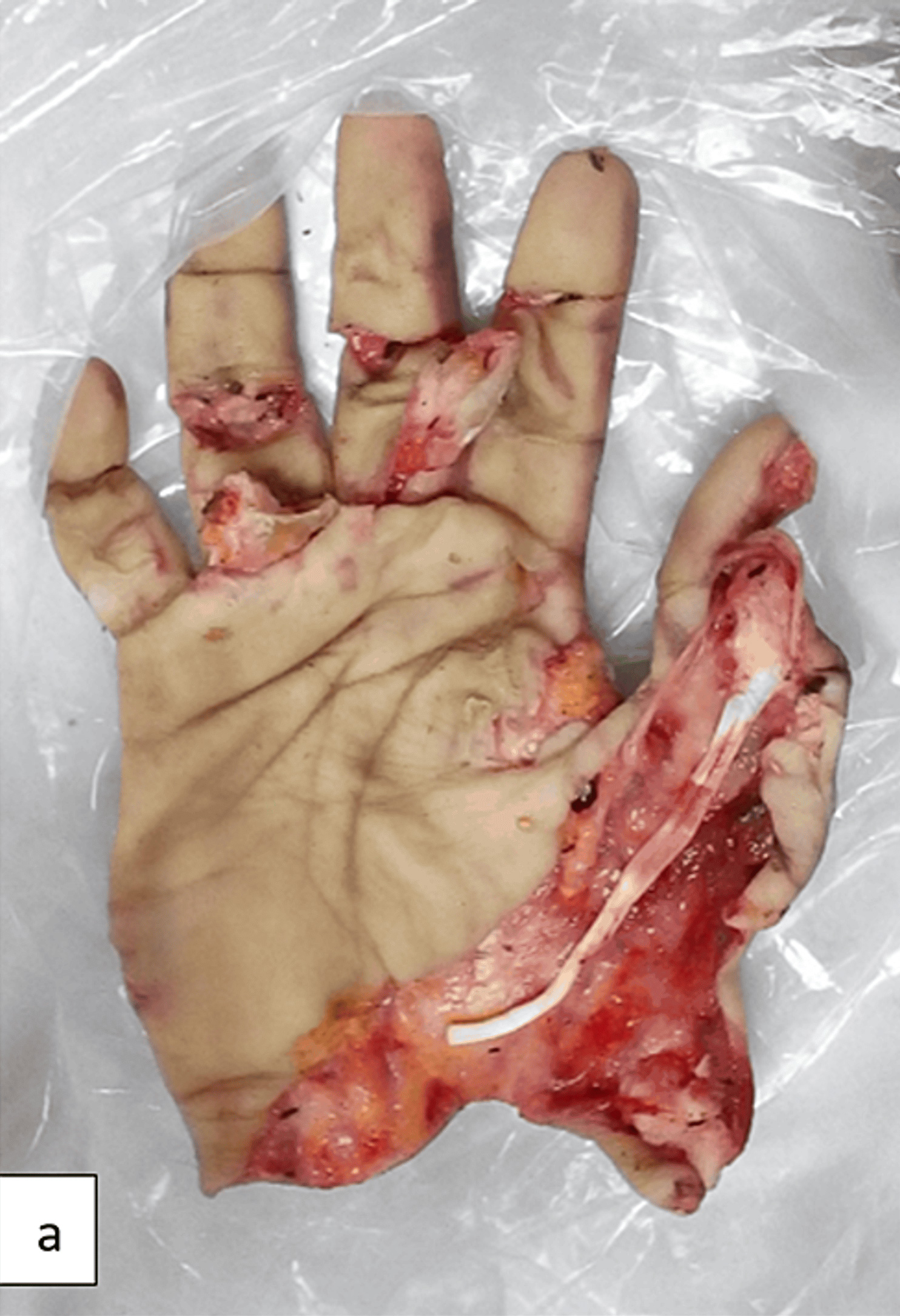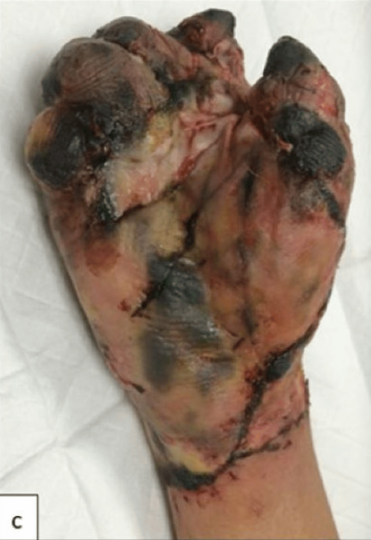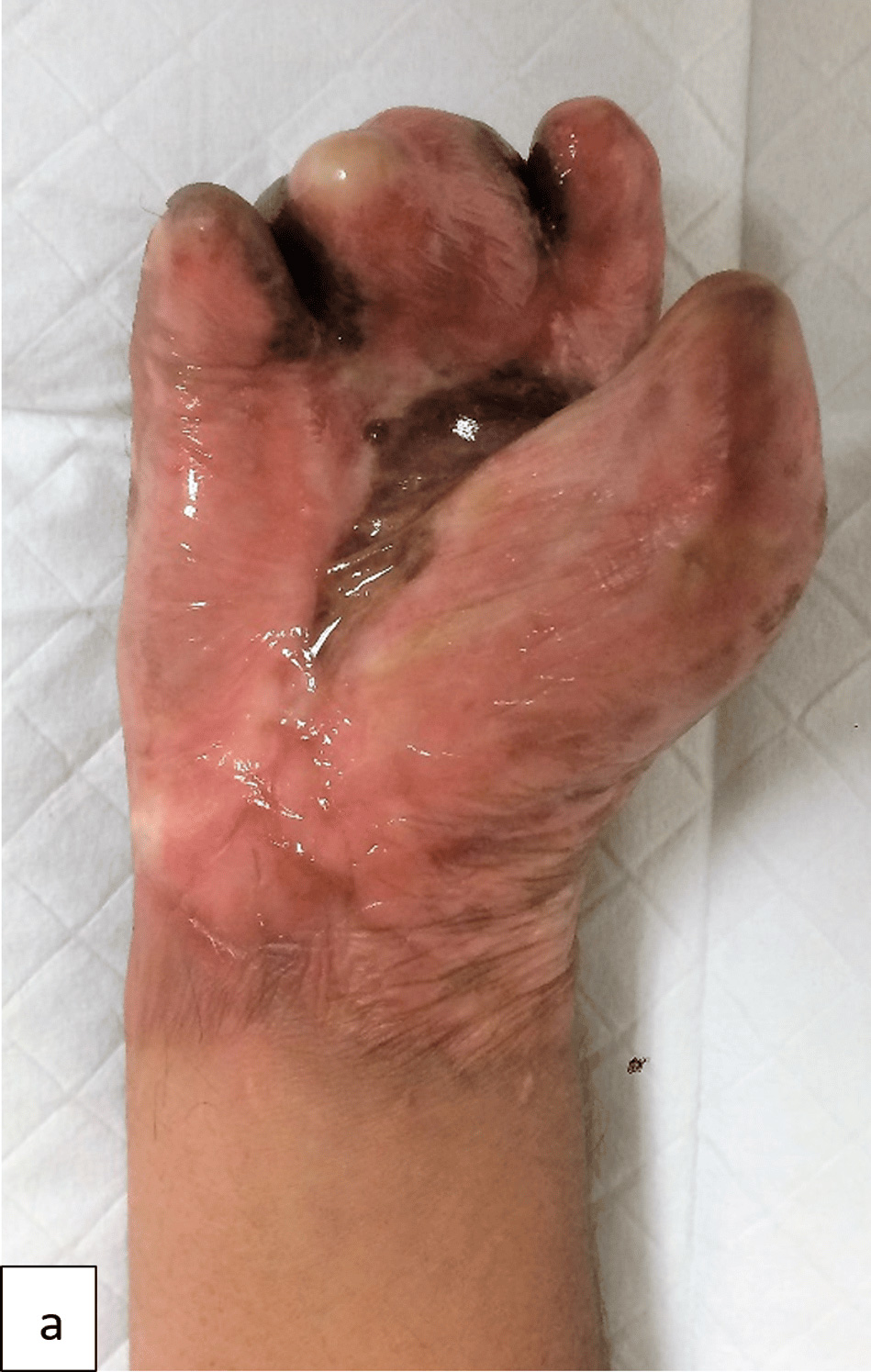 機械に手を巻き込まれ、皮膚を剥がされてしまった23歳男性の手術工程画像。