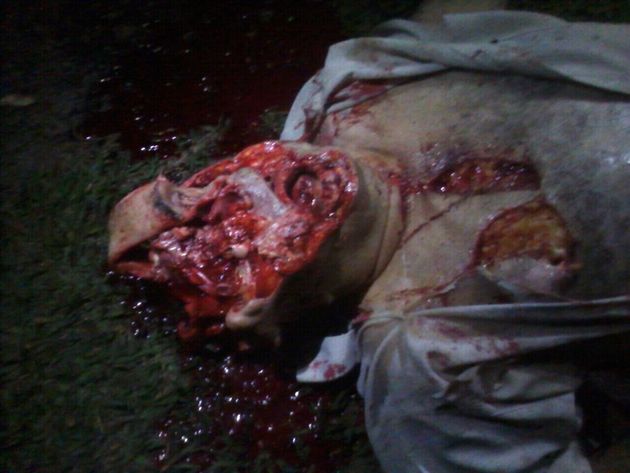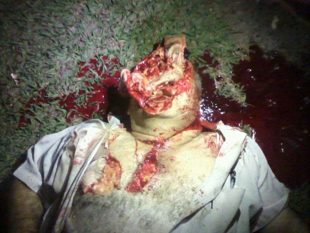 ヘリコプターのプロペラに当たって顔がスライスされてしまった男性の死体を撮影したグロ画像。